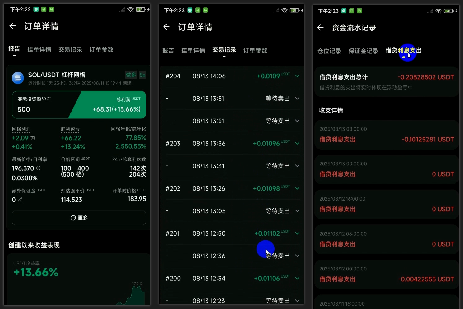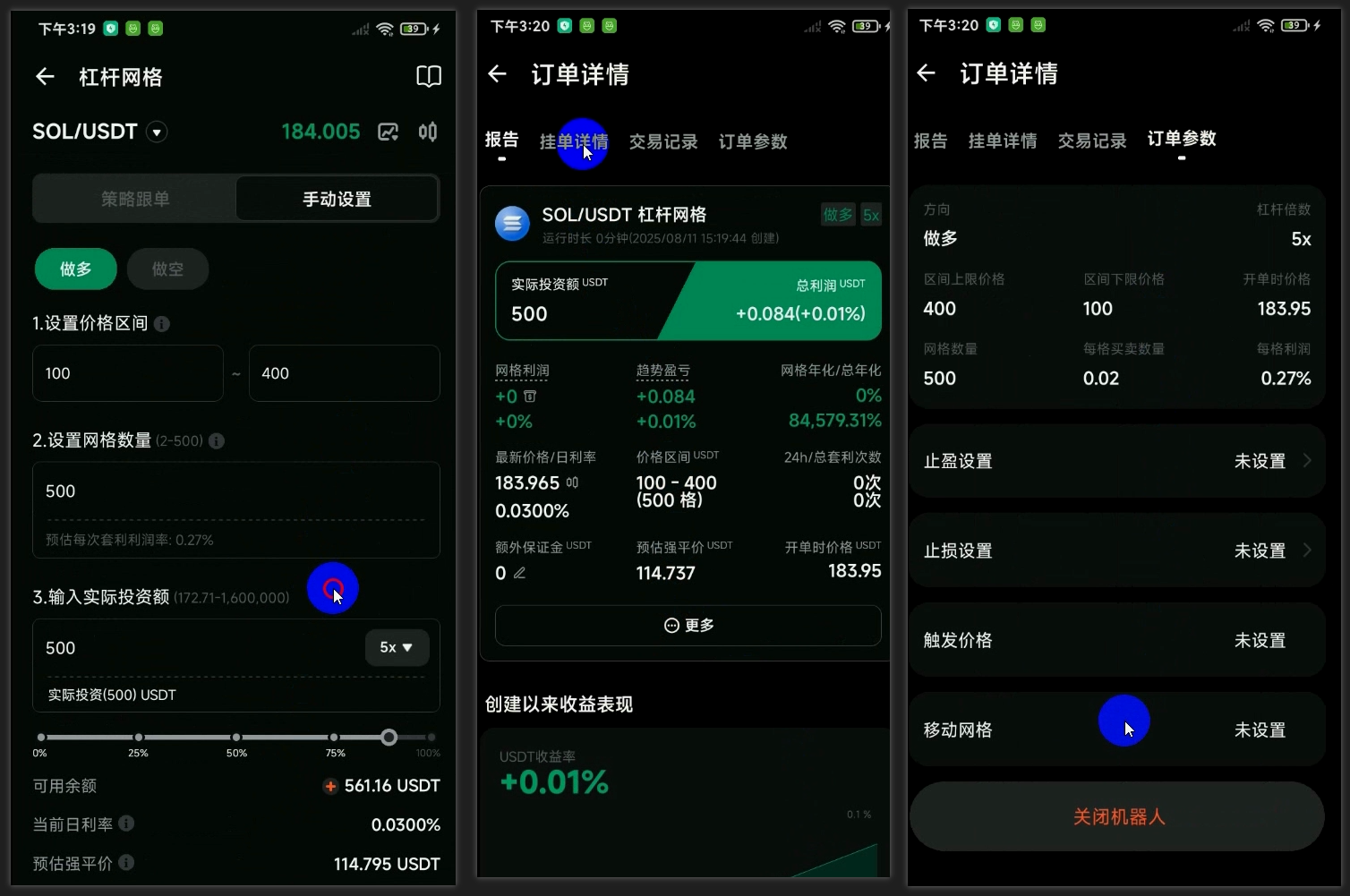 由于最近 ETH 价格上涨的比较多,但是 SOL 的价格还没有上涨,所以我开的是 SOL 的杠杆网格来做测试。