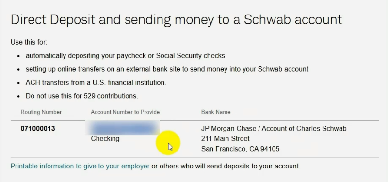 嘉信理财提供一个 Direct Deposit 的入金帐户,它是摩根大通银行的帐户。帐户名称是自己的姓名,也就是嘉信理财给我们提供了一个个人同名的帐户来入金。(账号的最后 8 位数字是嘉信理财的 id)