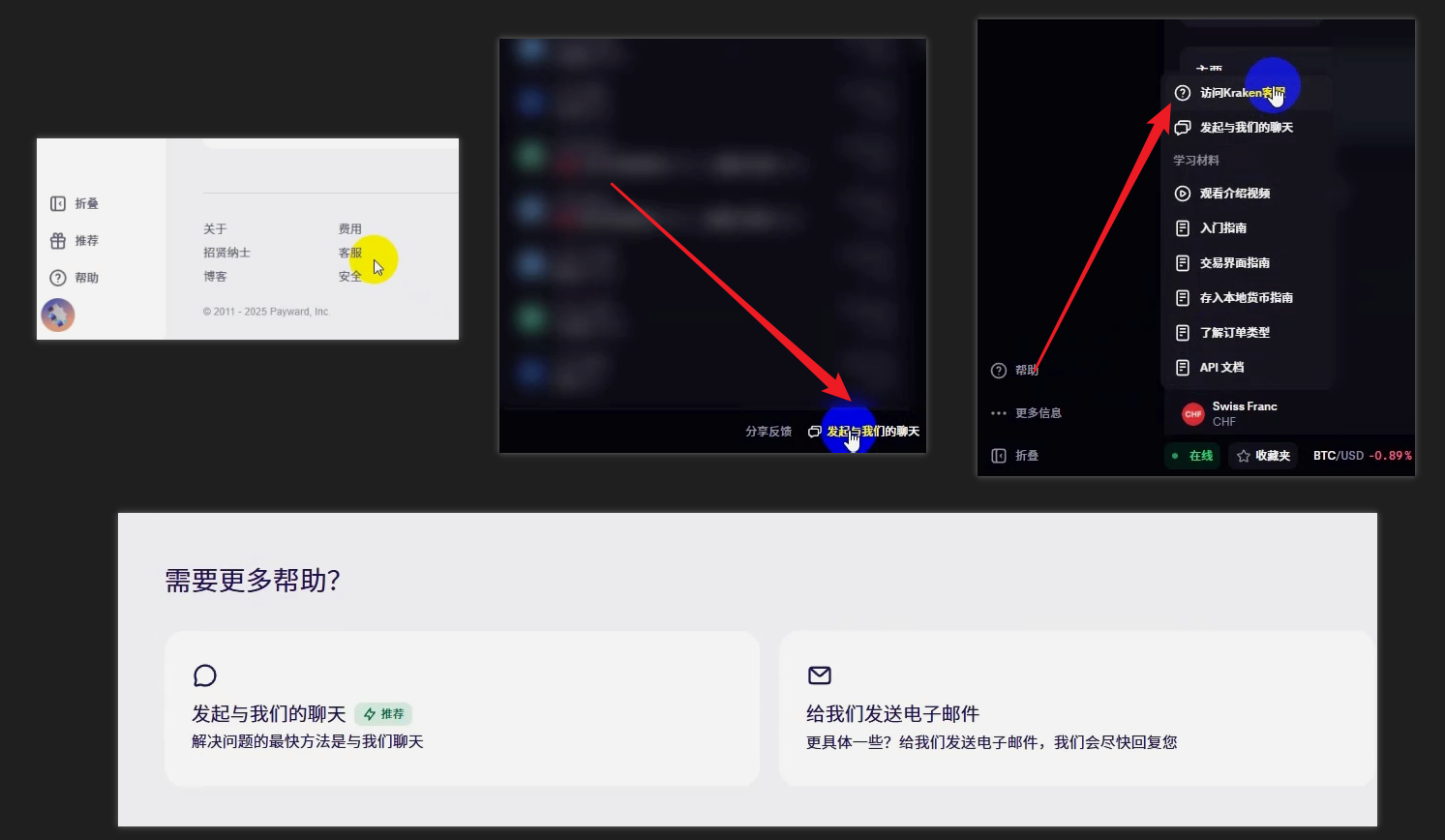 在 Kraken 页面的最底下,可以看到:客服的按钮,或者在 Pro 的网页,右下角,就可以点击跟客服聊天。又或者在帮助中心查找客服。一般情况下,简单的问题,可以找在线客服聊天,如果是稍微复杂一些的问题,我个人推荐通过发邮件的方式来连续客服处理。