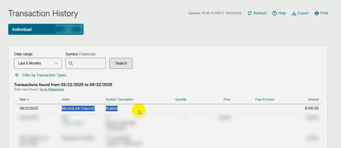 Kraken 通过 ACH 的方式转账,一般是一个工作日就可以转账到嘉信理财。入金显示的是:MoneyLink Deposit ,入金的名称显示是:Kraken