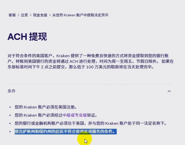 如果你的 Kraken 帐户不是使用美国的地址来注册的,你是没有 ACH 这个出金的方式的。大多数人注册 Kraken 的时候,居住地址写的中国大陆,那么是无法通过 ACH 转账到嘉信理财的。对于中国大陆的小伙伴来说,你至少要有 ITIN 才可以去尝试申请美区的 Kraken 帐户。然后就是你的美国私人地址不能是德克萨斯州和纽约州的。在申请 ITIN 的时候,不要用这两个州的地址。