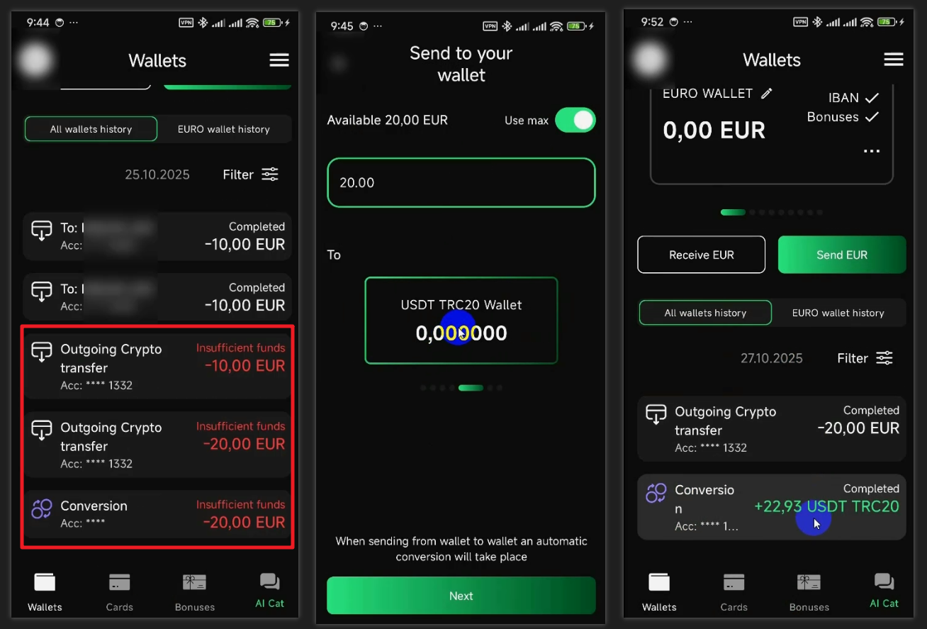 一开始我用欧元兑换 USDT 是失败的,可能是周末他们不处理,我在工作日的时间来进行兑换才可以。兑换的损耗大约是 1.5%,兑换要等几分钟才处理完成。