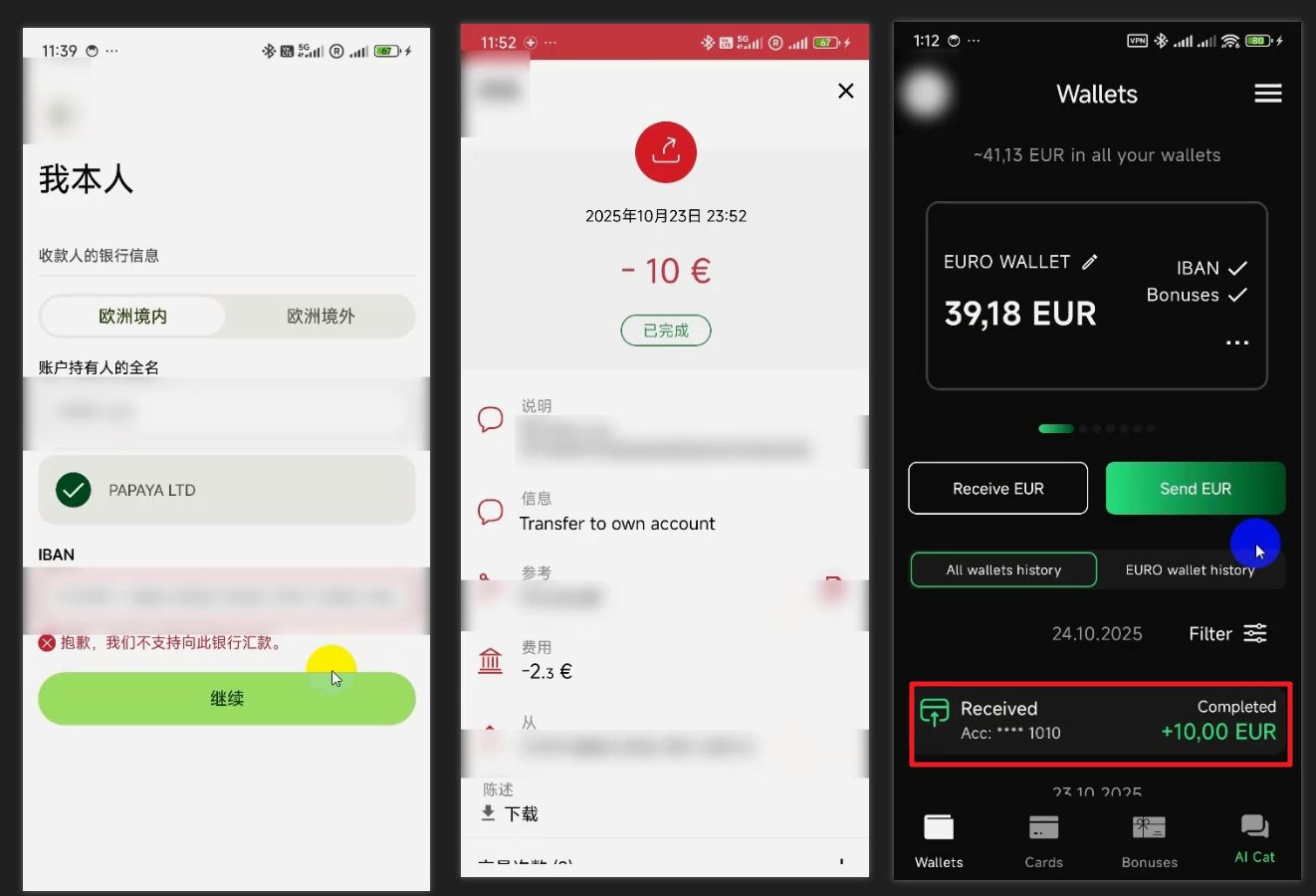 黑猫卡有个人 IBAN,支持中国大陆的小伙伴开户,对加密货币比较友好,可以接收 Kraken 的资金,并且黑猫卡可以转账到 Wise。每月有 5 次免费转账的机会!非常值得推荐使用!
