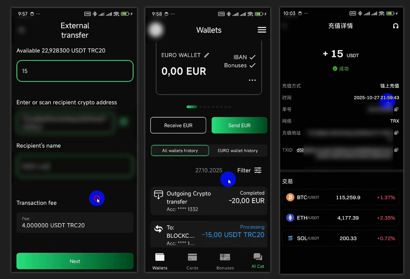 它支持中国的地址注册,并且提供个人银行帐户,支持加密货币入金和欧元入金,支持提现欧元到你的个人银行帐户,也就是你通过黑猫卡入金交易或者从交易所出金都是完全没有问题的!