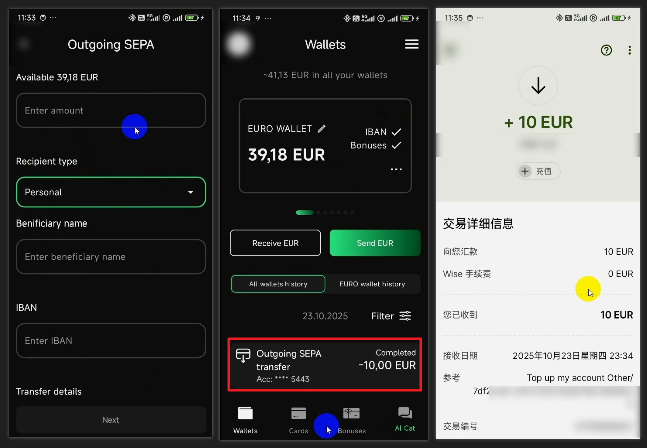 Wise 不支持转账到黑猫卡(之前的保加利亚 IBAN 是可以的),然后我们可以用杜高斯贝银行转账欧元到黑猫卡,转账的费用固定收取 2.3 欧元。杜高斯贝转账是非常慢的,我的黑猫卡是第二天才到账的。
