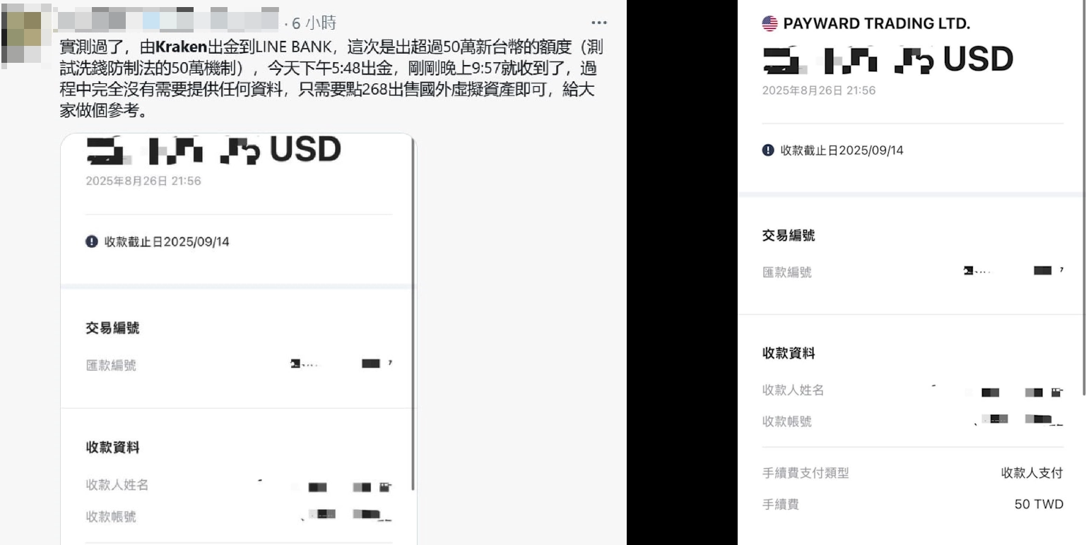 有小伙伴分享使用 LINE Bank 接收 Kraken 海妖交易所的资金。他是说转了 50 万新台币(估计大约 1.6 万美金)。