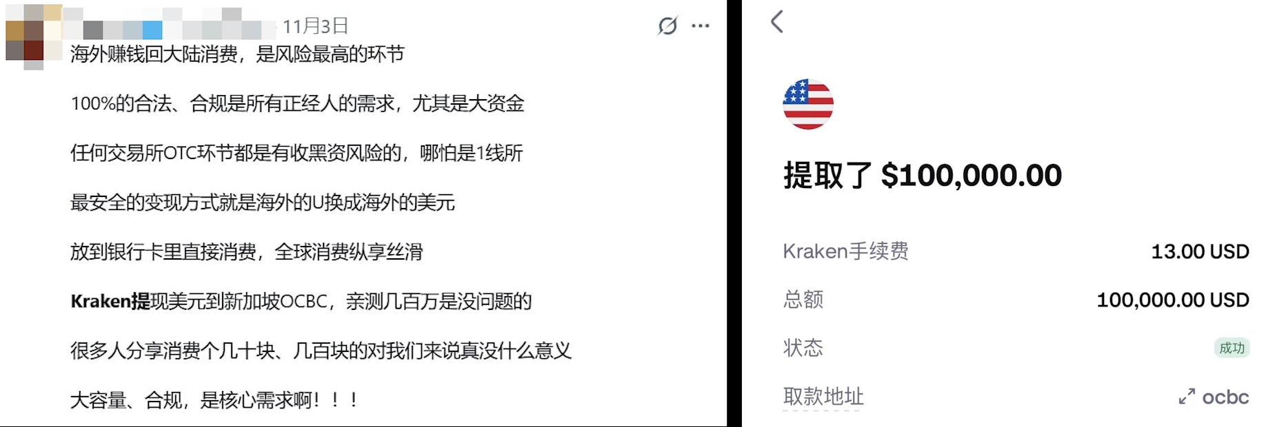 有人分享使用 Kraken 单笔出金 10 万美金到新加坡的华侨银行(Kraken 单笔限额 10 万美金,每月出金额度是 50 万美金),并且他亲自测试,转账了几百万都没有问题!