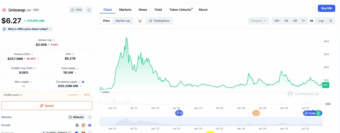 Uni 最高超过 40 美金,现在是 6.2 美金,这几年最低是 4 美金左右,最近如果要 DCA 购买是非常不错的。