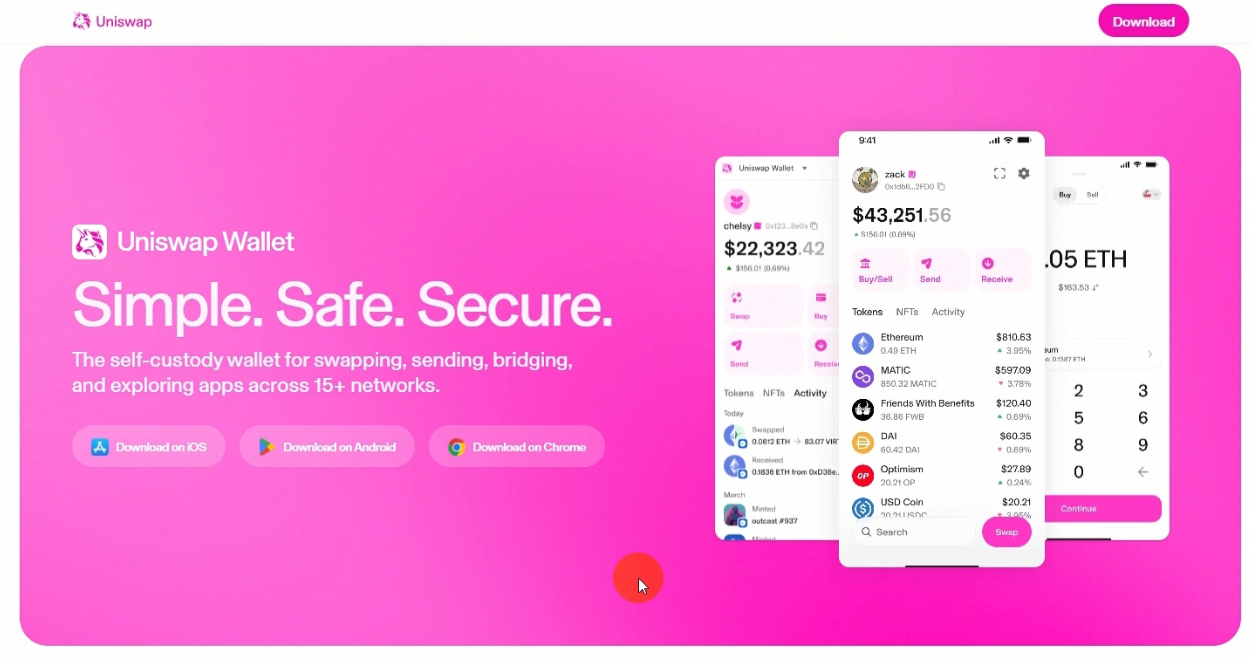 Uniswap 也推出他自己的钱包,通过助记词生成钱包,可以交易代币,支持智能钱包功能,支持非常多的公链。