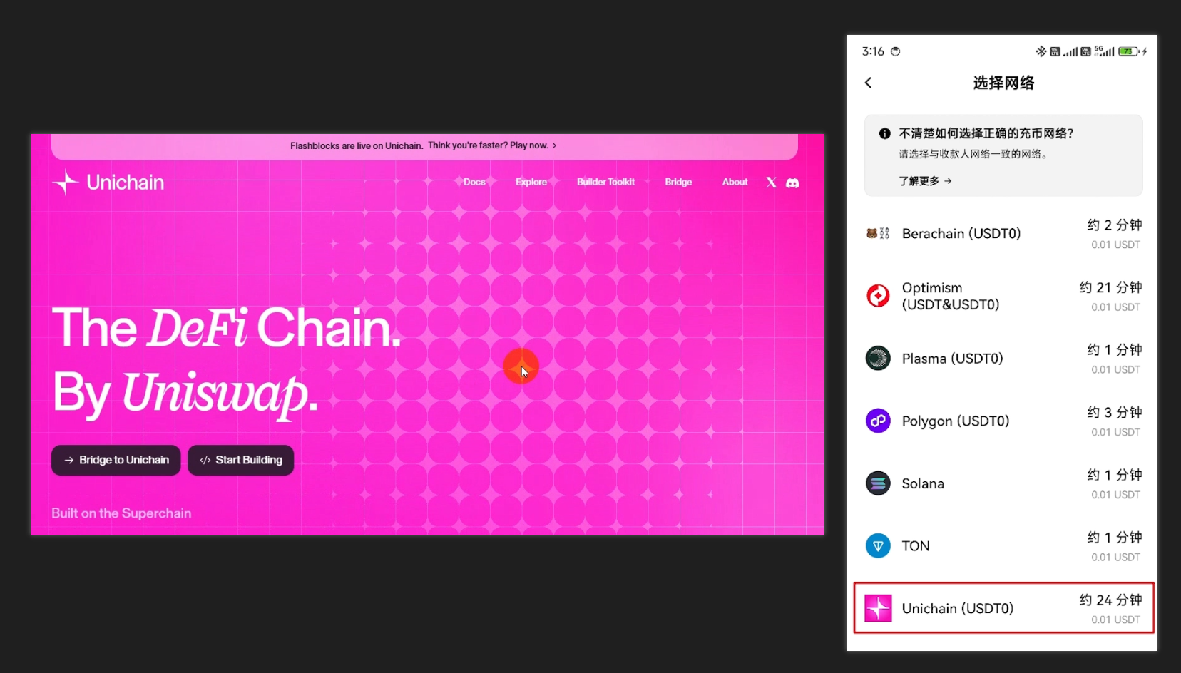 Uniswap 发行自己的公链 Unichain,但是很少有交易所支持,目前我看到 OKX 交易所的 USDT 支持使用 Unichain 这条公链。